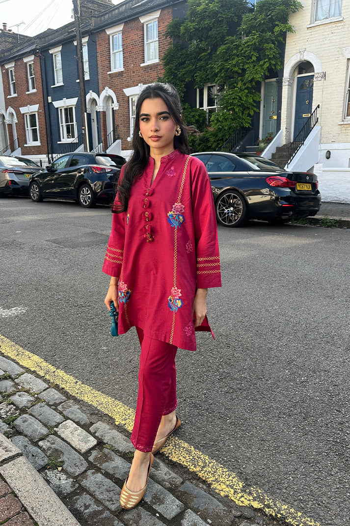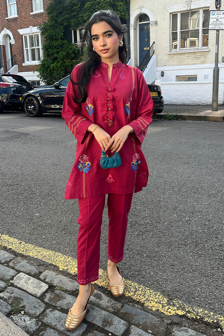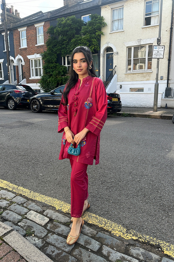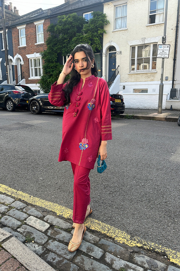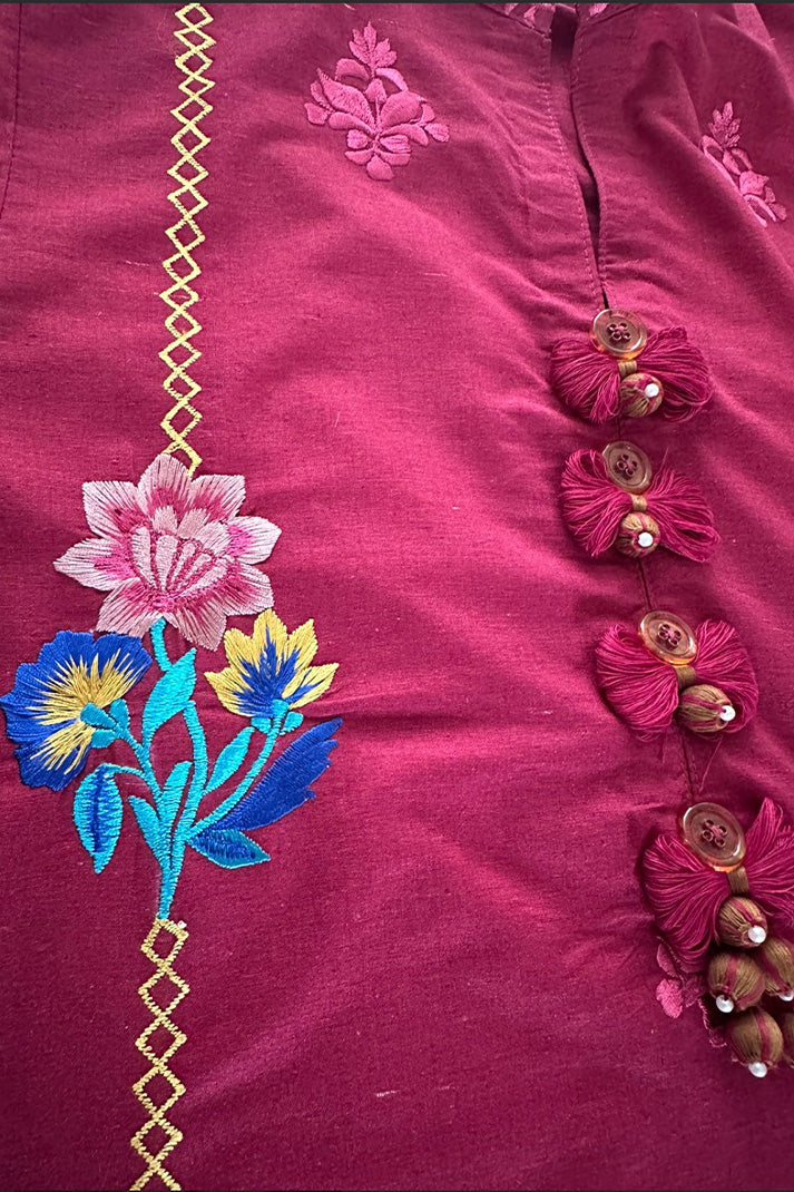 A Very Powerful Winter Tone Fully Hand Embroidered Shirt with Stripes and floral Motif both in monotone as well as Contrast. Embroidered Neckline and Trousers. Don’t Miss Out the handmade bow tassels.