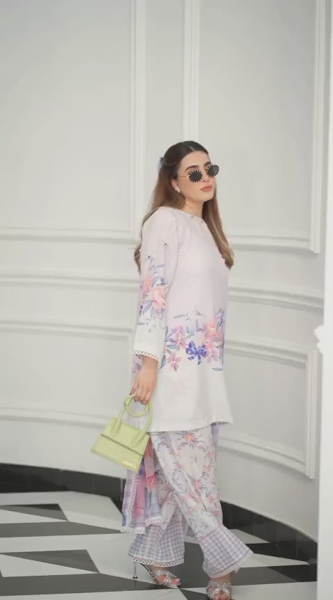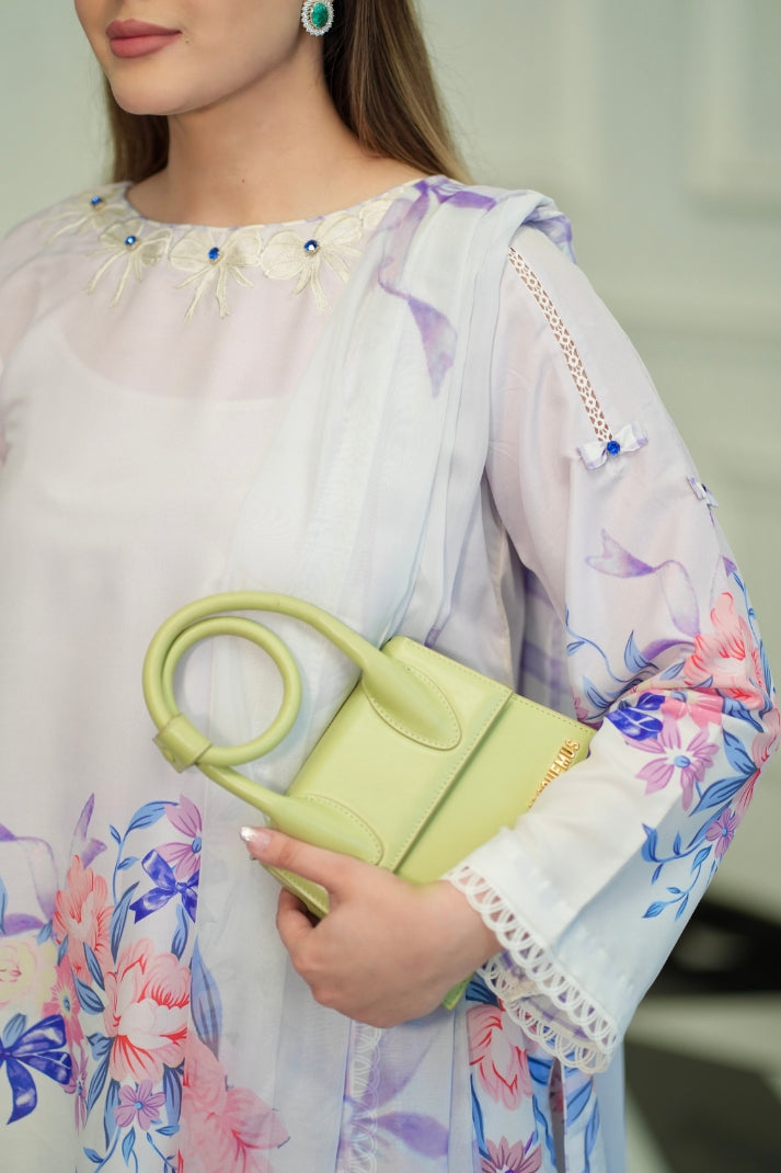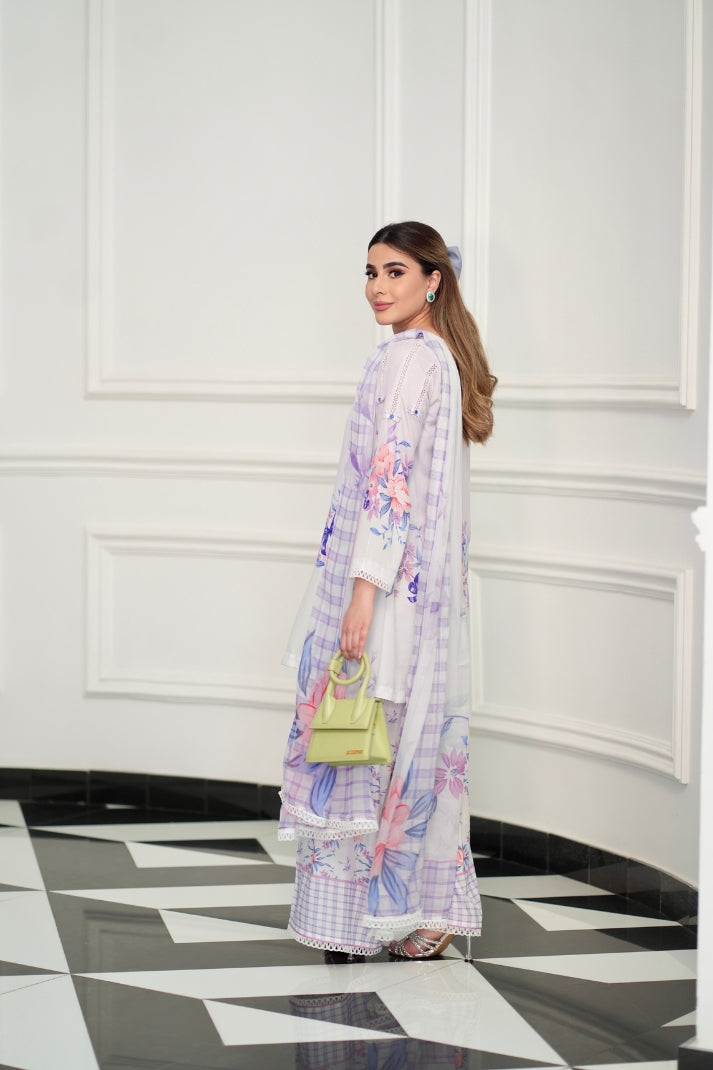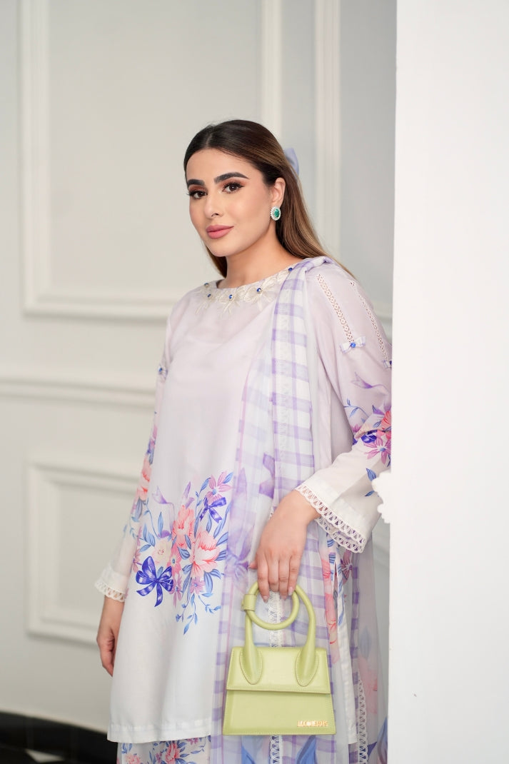 A graceful digital printed 3-piece outfit on a light lavender base, featuring pastel pink and purple border florals. The neckline is embellished with bow-shaped embroidery and bead accents, while scalloped lace trims finish the sleeves and hem. The trouser carries a subtle lavender-white check pattern, paired with a dupatta adorned with scattered bows and a 4-sided check border, creating a balanced, whimsical look