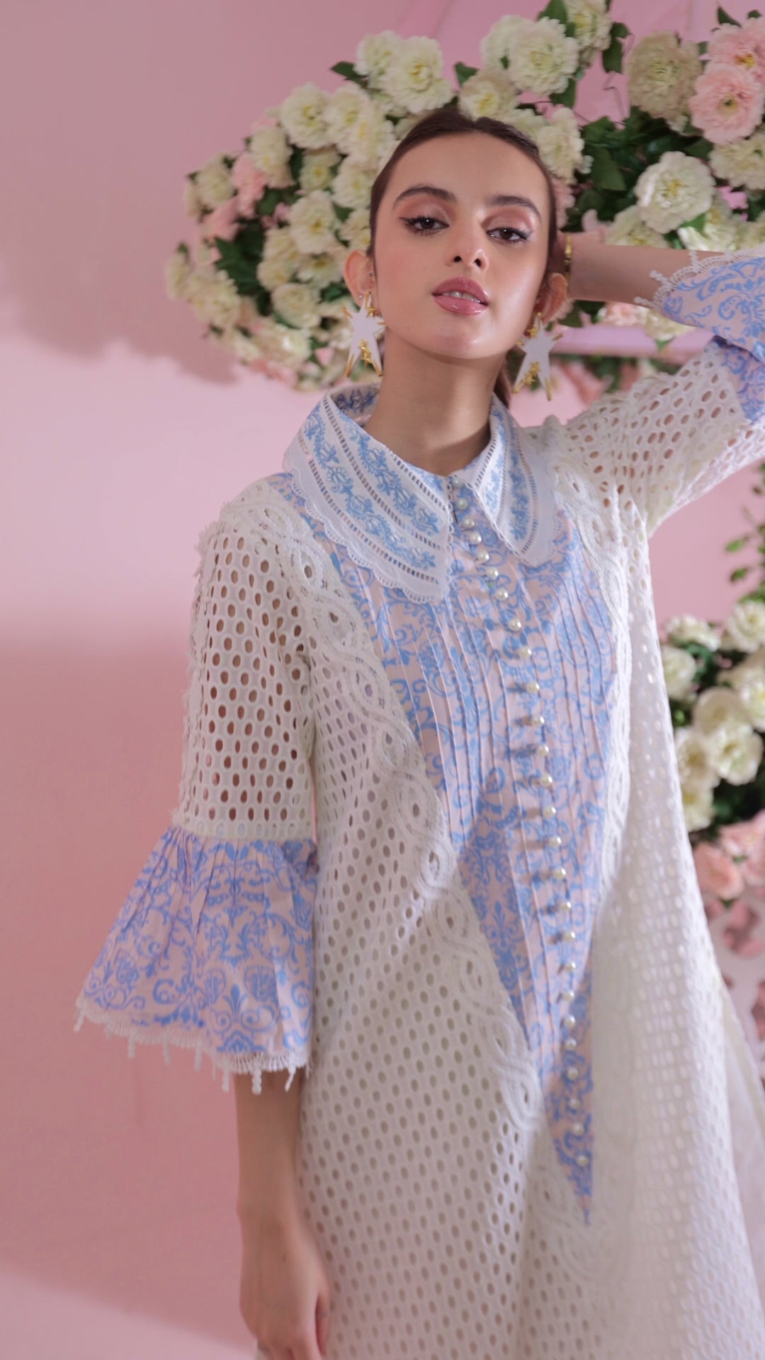 Blue fever-Let’s add that oomph to your wardrobe indulge into style with our intricately embroidered collared long shirt with print and Shiffli and an overload of laces…