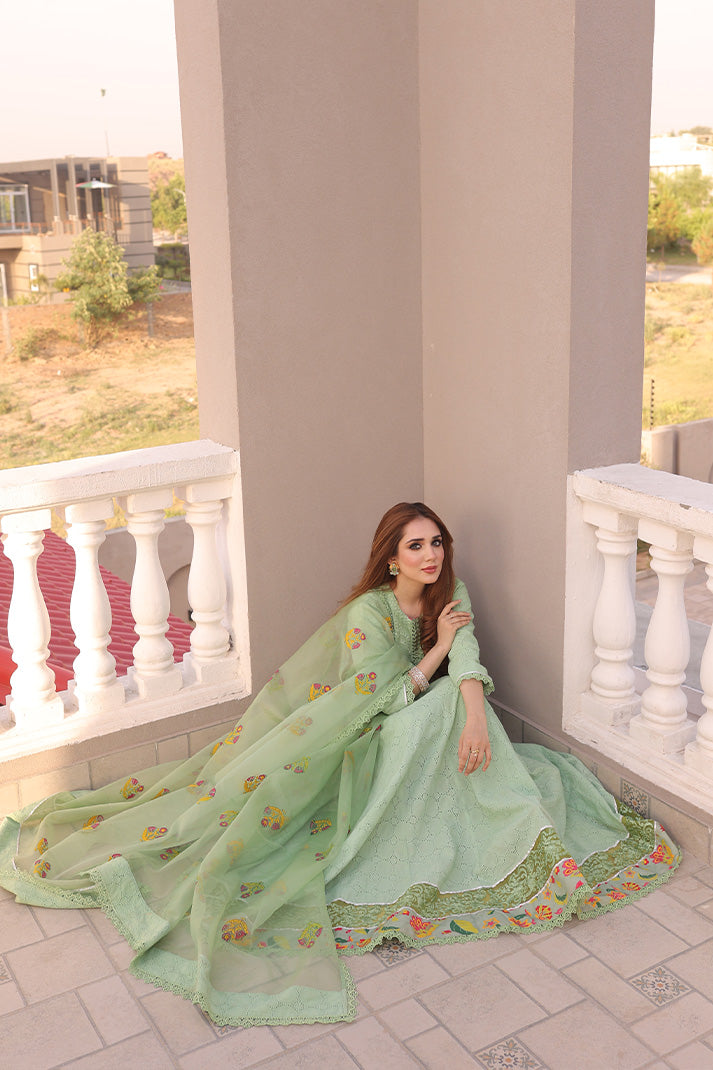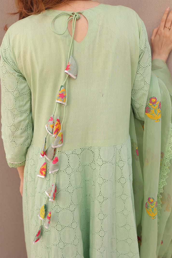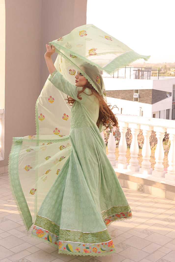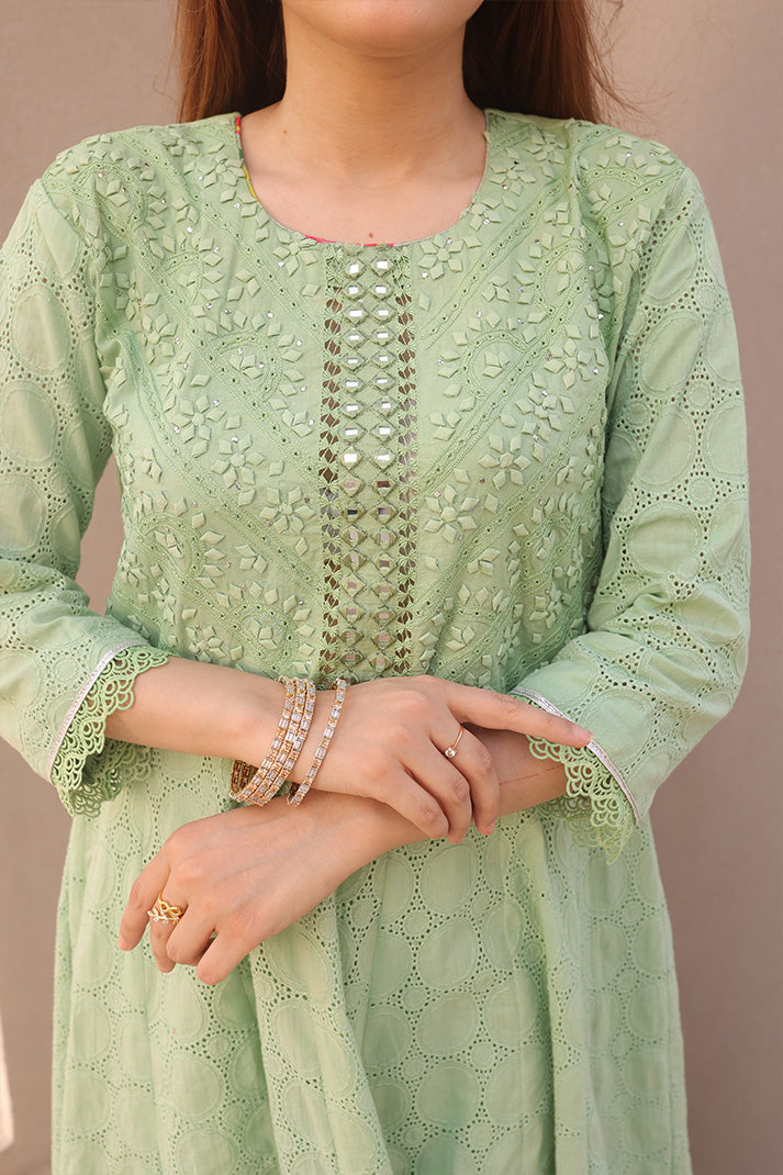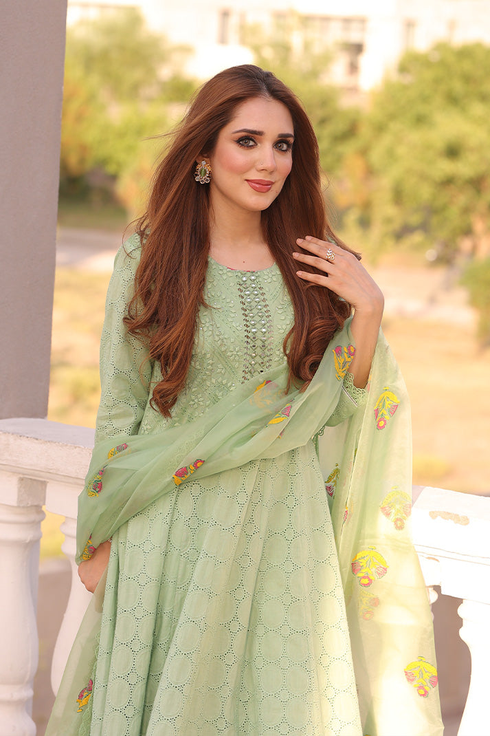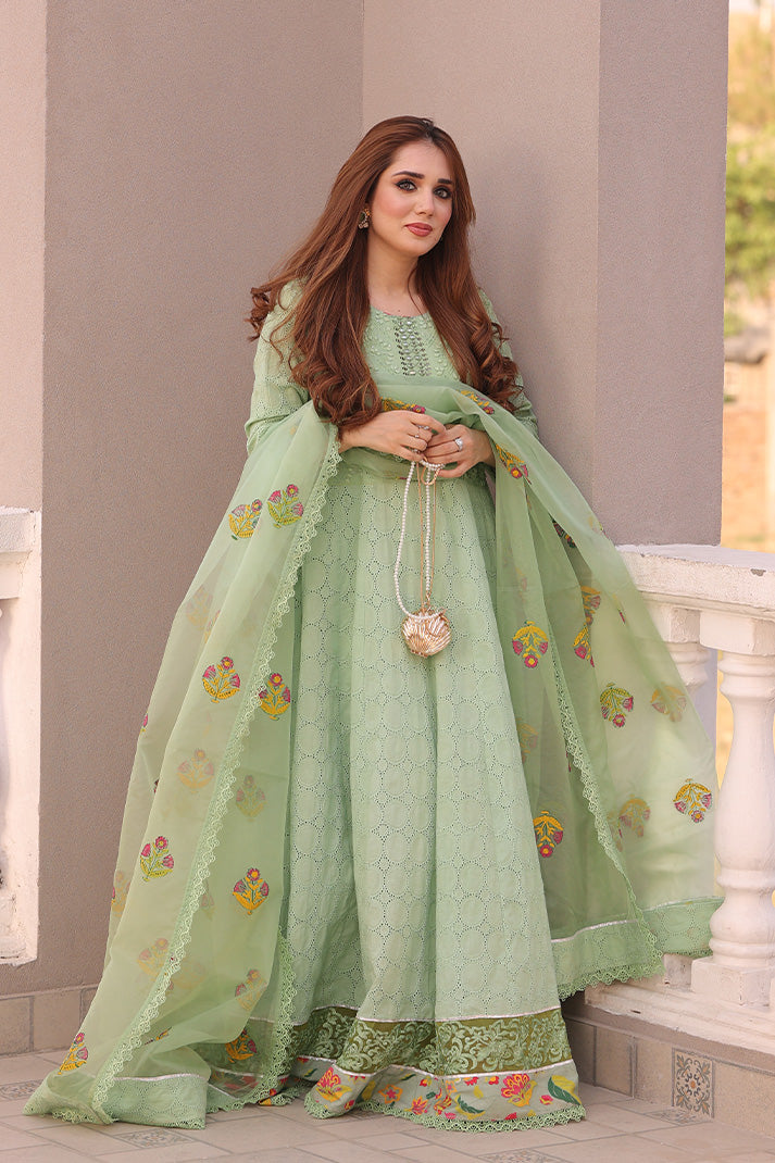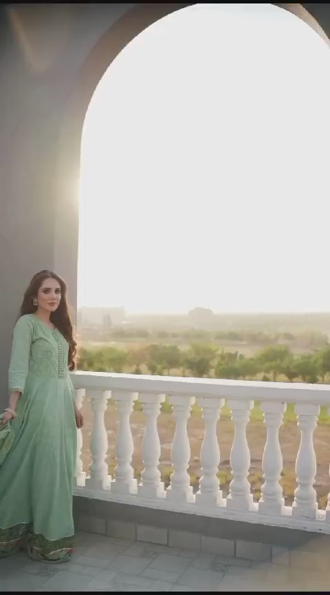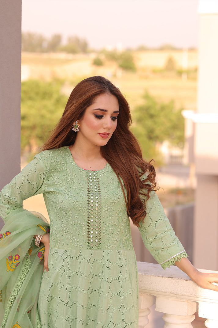 Introducing our pistachio elegance in a captivating hue .Crafted from luxurious Chickankari , this dress features intricate applique patti work adomed with mukesh and taar kashi on the bodice, creating a dazzling centerpiece of mirror work .The frock’s border is a harmonious blend of printed fabric and delicate embroidery , adding a touch of sophistication .Paired with a block-printed dupatta , embellished with delicate laces, this ensemble is a perfect blend of traditional craftsmanship and modern elegance .Elevate your wardrobe with this timeless piece
