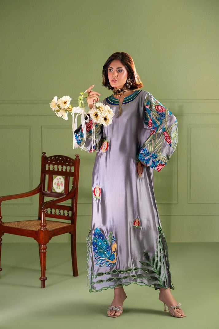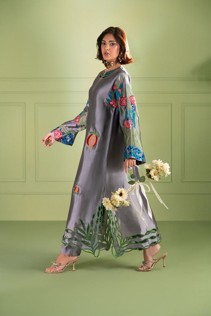 This exquisite kaftan is crafted from lustrous sheesha silk, bringing a radiant sheen to your look. The silhouette features a graceful fall with peacock embroidery at the hemline, enhanced by delicate cutwork scalloping that adds a touch of finesse. The sleeves are richly embroidered, showcasing vibrant hues that complement the artistry of the ensemble. Scattered across the shirt are unique pomegranate-inspired motifs, blending tradition with modern charm. Designed for those who appreciate timeless elegance, this kaftan is a true statement piece for festive soirées and refined occasions. It is paired with straight pants.