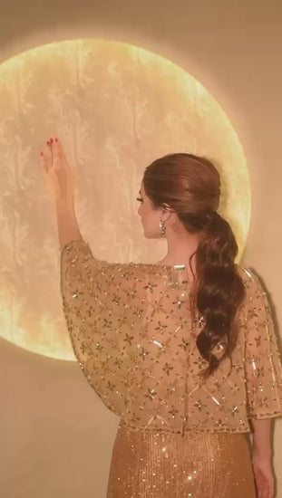 This 3-piece ensemble pairs a fully embellished sheer cape with a fish-fitted flared lehnga. Worn underneath, a pure silk blouse adds refinement and structure, perfectly complementing the richly adorned cape. The cape features dense handwork with thread crystals, sequins, and tube beads in neon colours arranged in shimmering lotus floral clusters. The sequined lehnga offers a fluid, luminous finish, highlighted with vibrant jewel-toned lotus motifs that add striking color and depth. Its fish-tail silhouette transitions into a soft flare, creating an elegant and structured look.