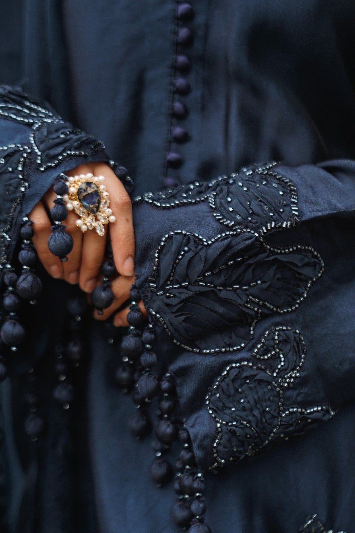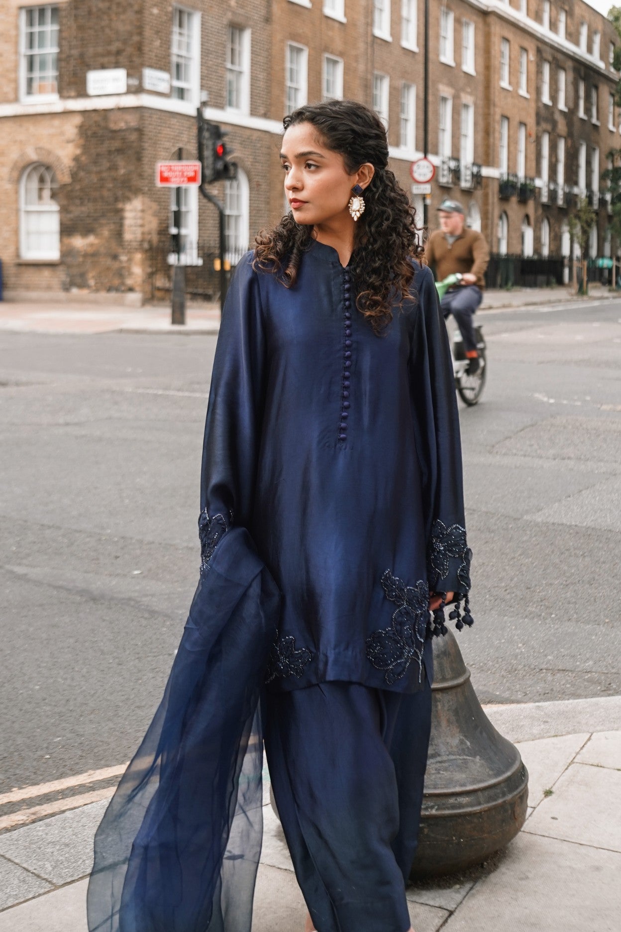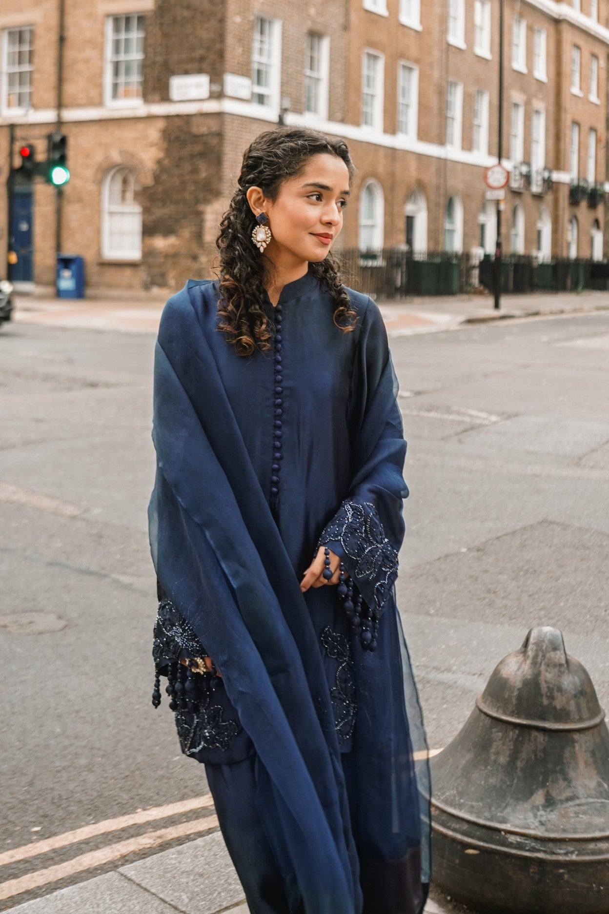 Step into understated glamour with Midnight Muse, a captivating navy blue farshi shalwar set crafted from premium silk. This ensemble features monotone sparkling handwork that adds depth and dimension without overpowering, while delicate hand-beaded tassels on the sleeves bring graceful movement and artisanal charm. A timeless silhouette with a contemporary spirit paired up with a sheer organza dupatta. Luxe, high end effortless fashion at its best