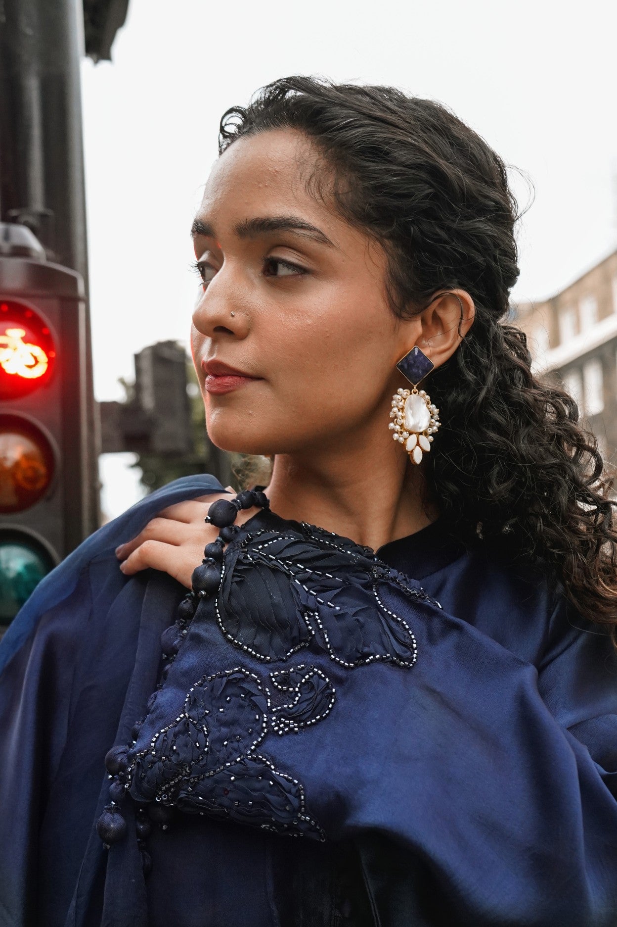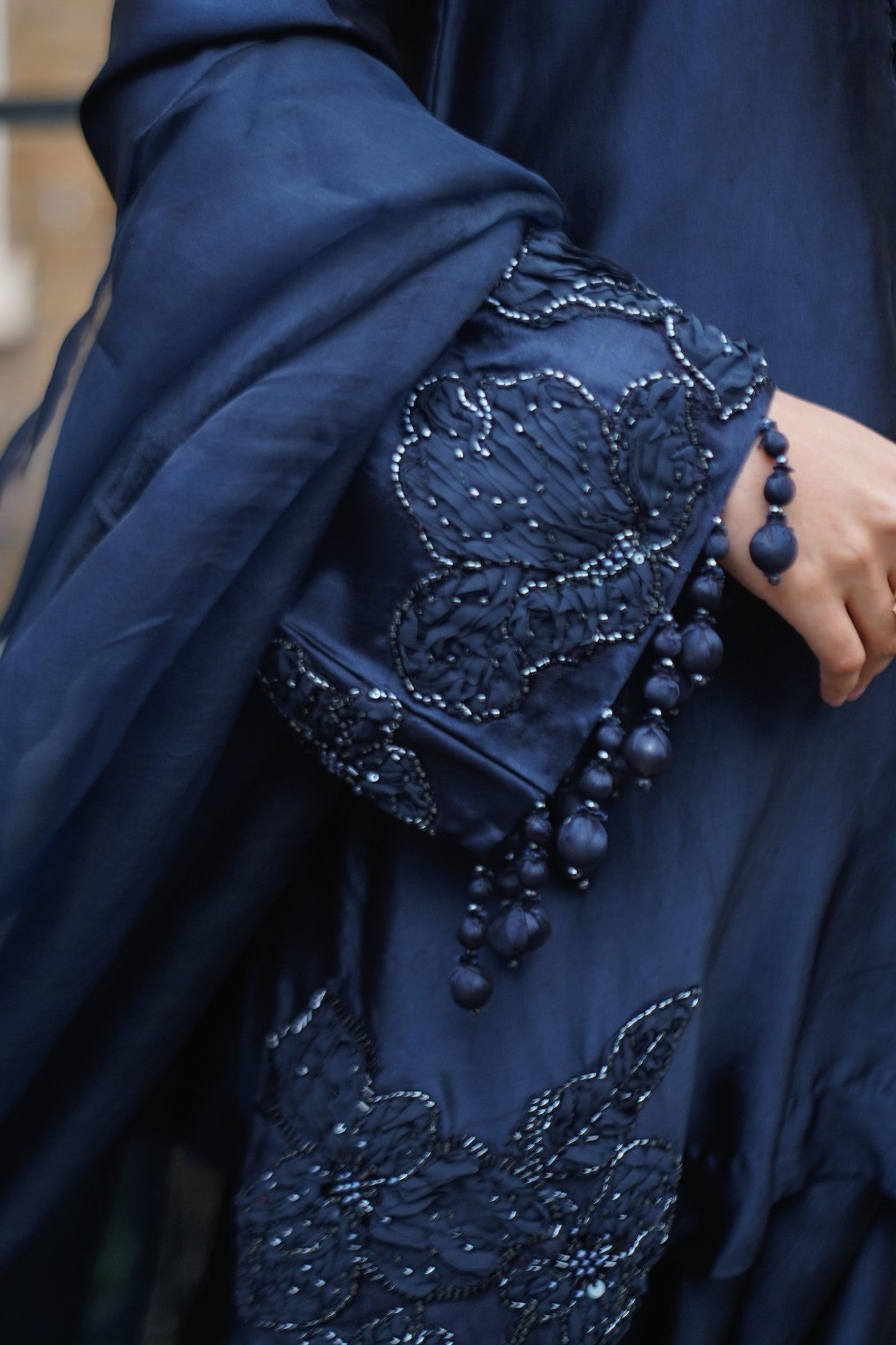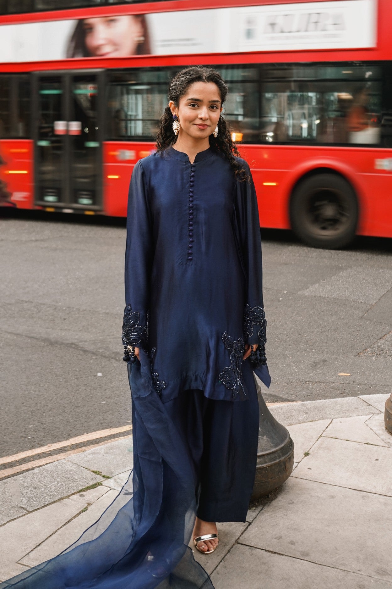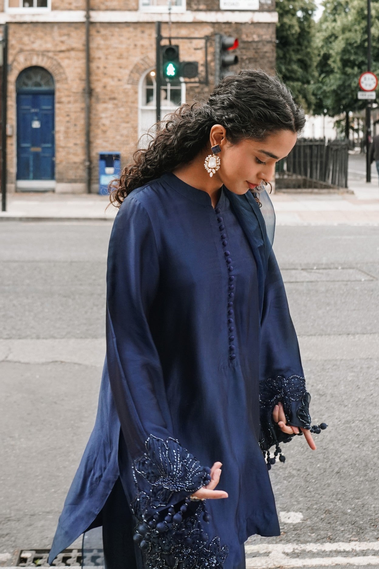 Step into understated glamour with Midnight Muse, a captivating navy blue farshi shalwar set crafted from premium silk. This ensemble features monotone sparkling handwork that adds depth and dimension without overpowering, while delicate hand-beaded tassels on the sleeves bring graceful movement and artisanal charm. A timeless silhouette with a contemporary spirit paired up with a sheer organza dupatta. Luxe, high end effortless fashion at its best