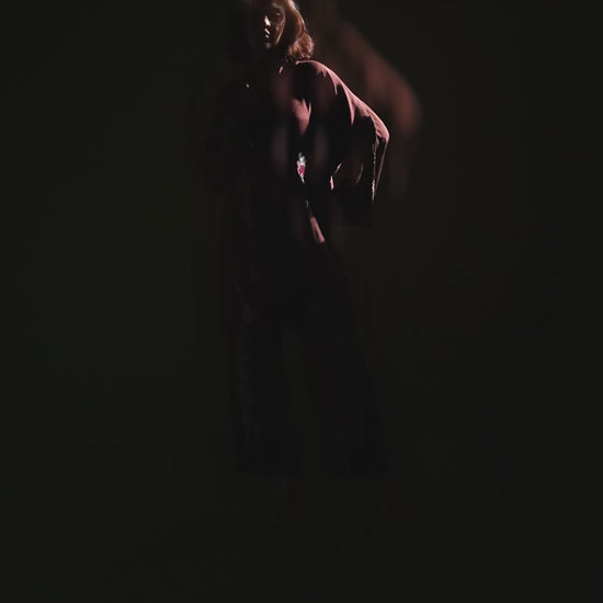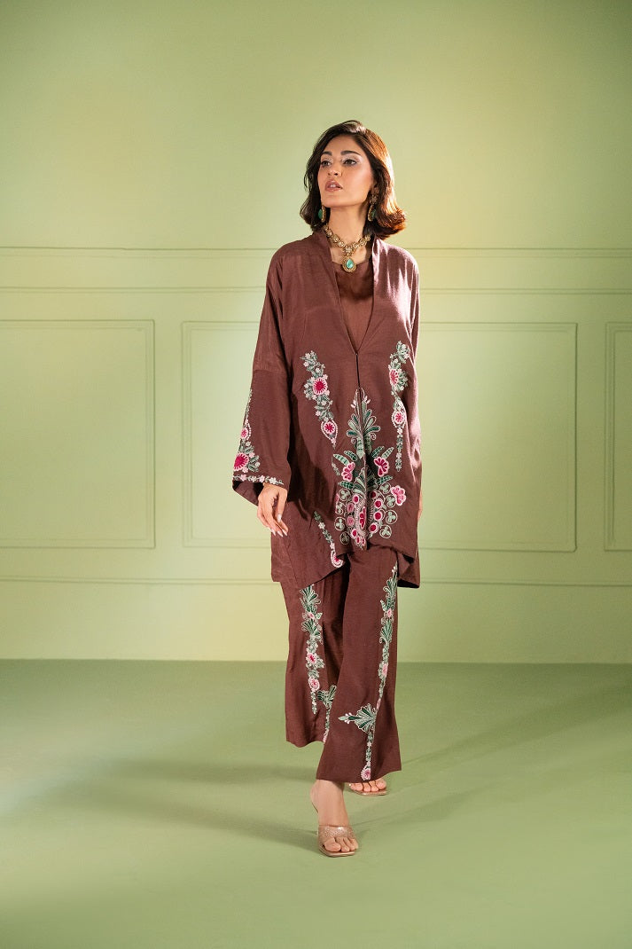 A rich two-piece ensemble rendered in luxurious Karandi silk, is a graceful expression of classic artistry. The front-open jacket is adorned with intricate thread embroidery, blooming with floral and ornamental motifs that trail along the front, sleeves, and hem. The back features a delicately detailed yoke, enhanced with symmetrical patterns and romantic accents, elevating the silhouette with quiet grandeur. Thoughtfully paired with wide-legged embroidered palazzo pants, the look is completed with a soft satin silk inner for refined comfort. Blending tradition with understated elegance, this ensemble is ideal for intimate festivities and graceful daytime gatherings