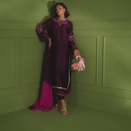 A regal three-piece ensemble crafted in lustrous sheesha silk, Moonlit Jewel exudes timeless sophistication. The shirt features intricate thread embroidery, with motifs accentuated through delicate stone, sequins and bead embellishments. Elegantly detailed organza patchwork enhances the sleeves, side slits, and the graceful U-shaped hemline, adding a contemporary charm to its classic appeal. Paired with straight sheesha silk pants and a flowing Amur silk two-tone dyed dupatta, this design is a harmonious blend of tradition and modern luxury — perfect for festive evenings and refined soirées