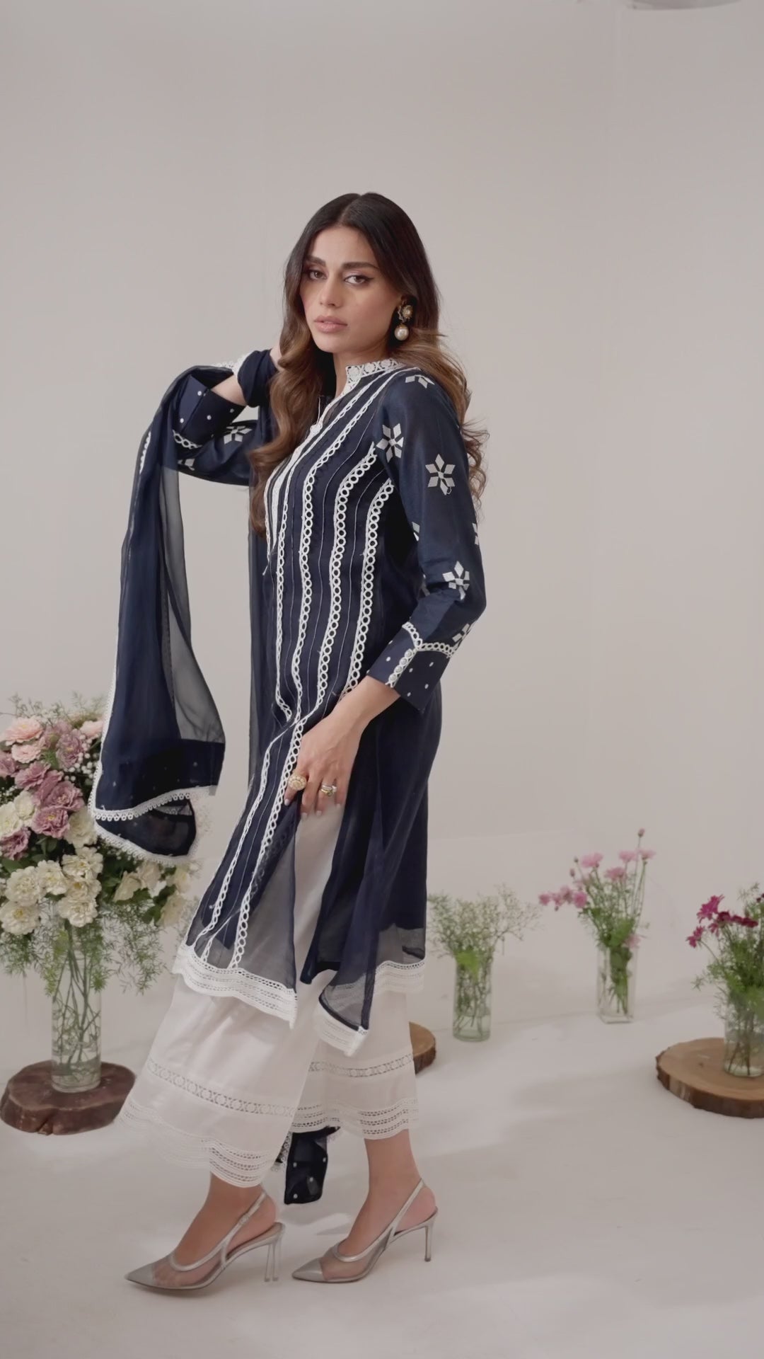 The Navy Orchid ensemble is a masterpiece that captures the essence of timeless beauty. The exquisite embroidery and intricate sleeves showcase the craftsmanship and attention to detail that goes into every stitch. The overlap cuff adds a modern touch, infusing the dress with a contemporary edge. The dyed chiffon dupatta completes the ensemble, adding a touch of elegance and grace with its delicate embroidered patti and lace.