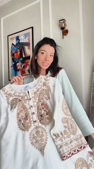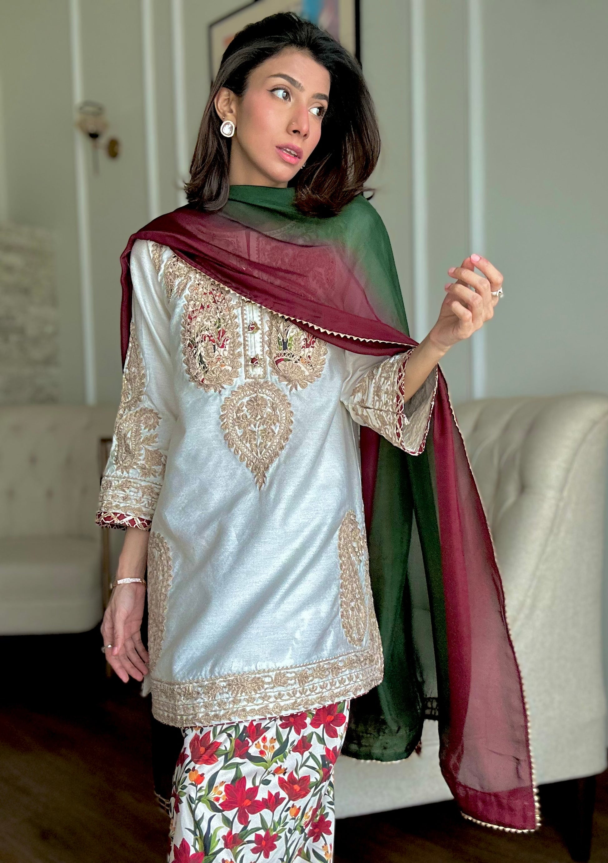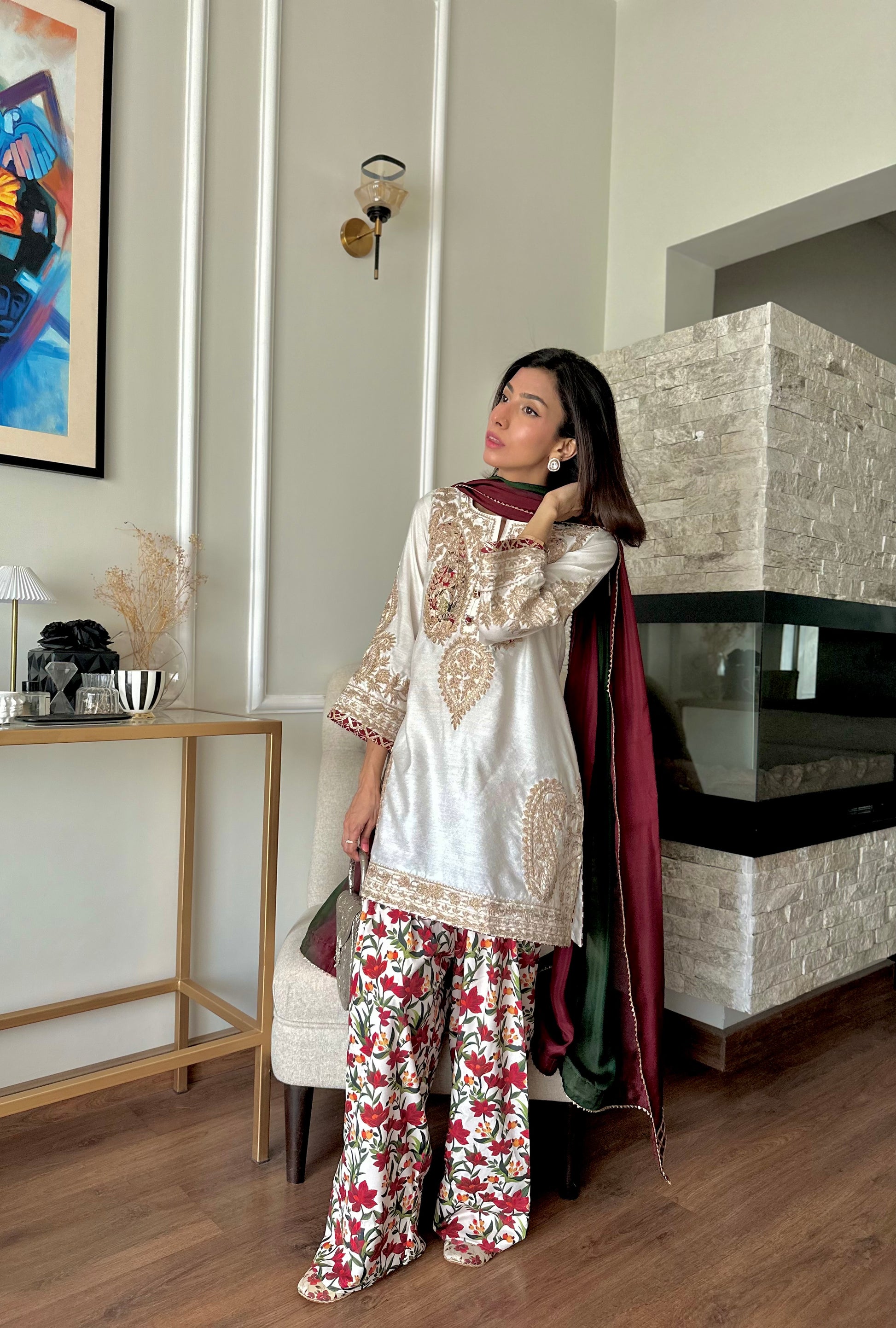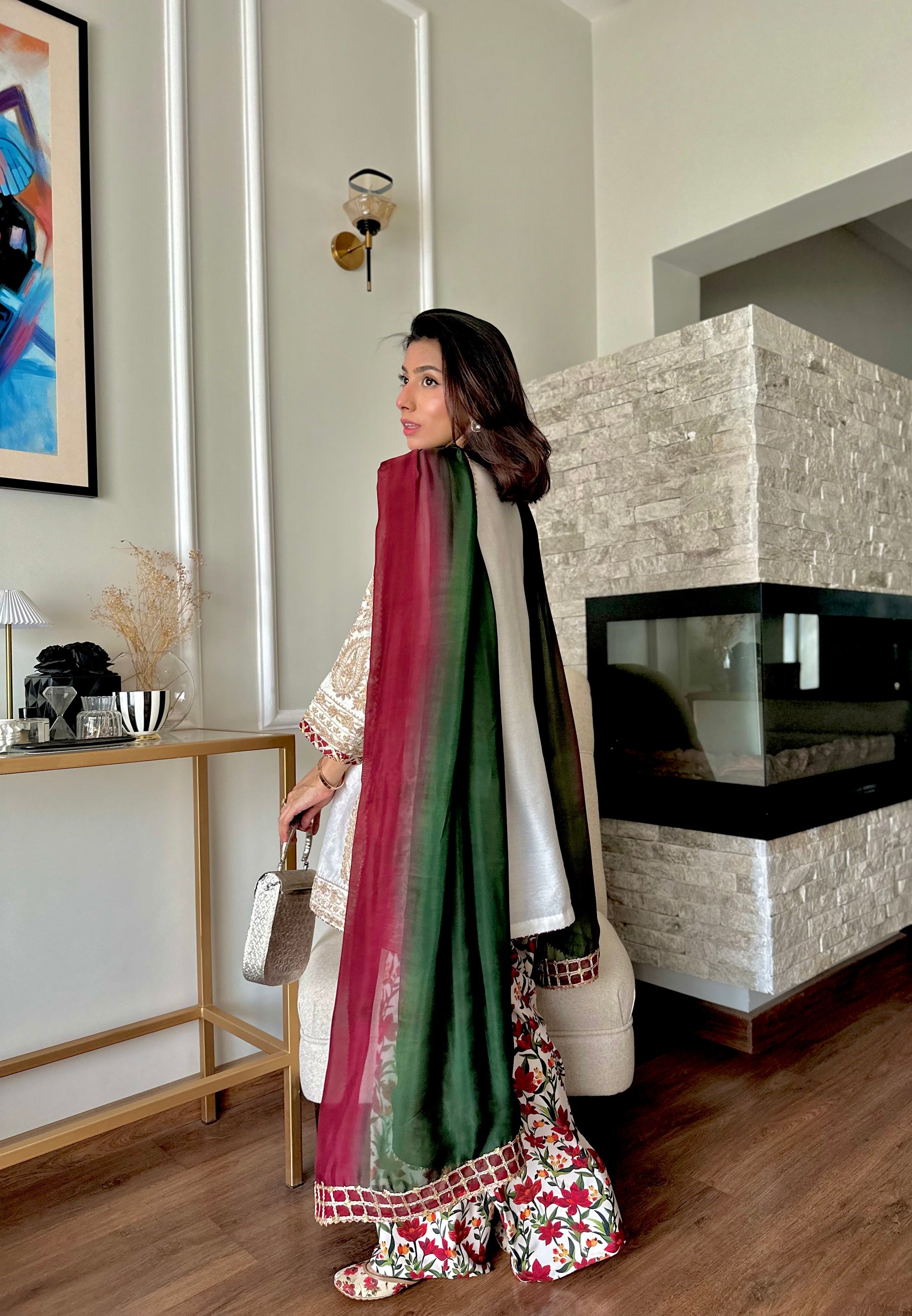 This 3-piece ensemble blends timeless tradition with contemporary charm. The shirt features intricate gold dori aari embroidery in paisley motifs, delicately worked over appliquéd printed fabric, adding depth and richness to the design by adding gotta handmade buttons on it. Paired with a striking printed farshi shalwar adorned in bold floral patterns, it brings a vibrant yet graceful touch. Completing the look is a two-tone dyed chiffon dupatta, beautifully finished with sequins gotta kinari border and embroidery for an elegant, festive appeal