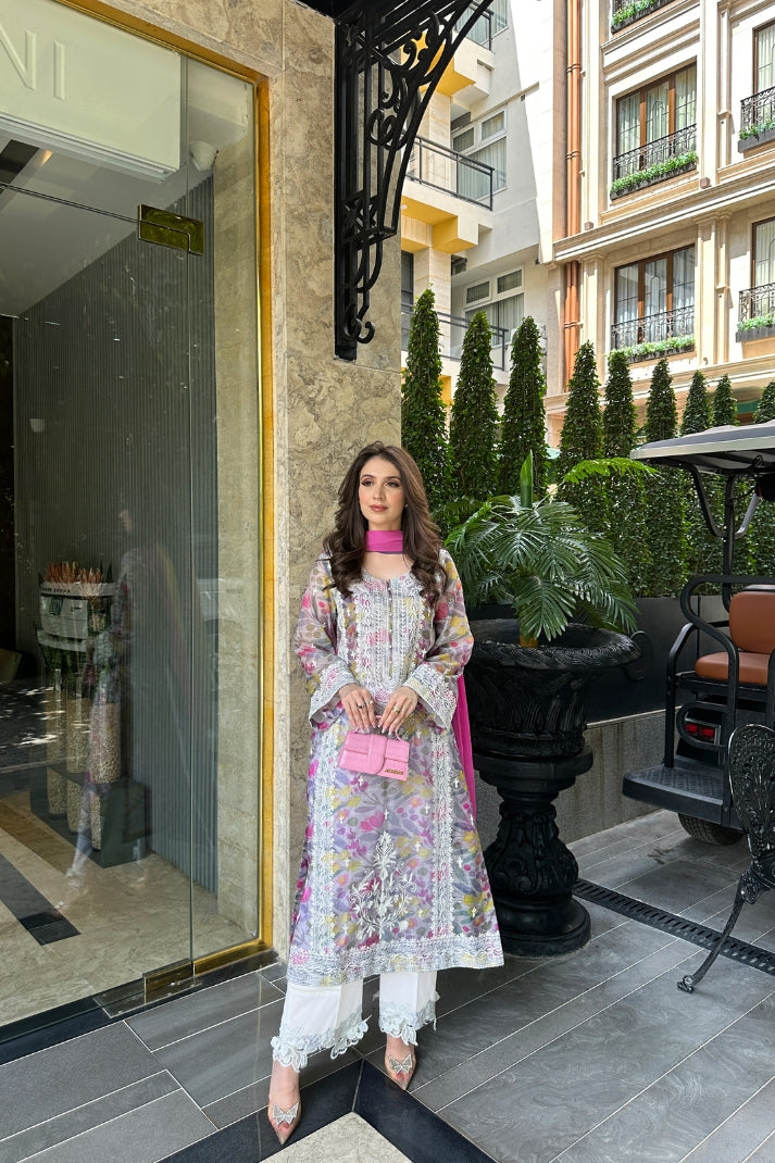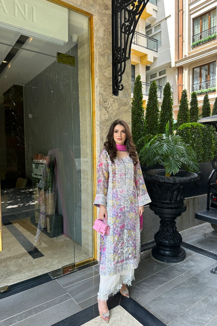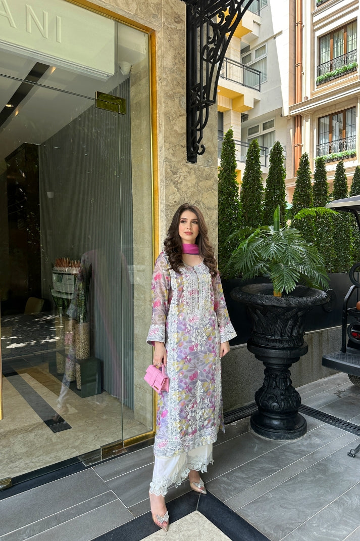 This 2-piece digital printed dress features a dreamy pastel canvas with a stunning floral burst in lavender, pink, and sunflower tones. The shirt is accented with intricate white aari embroidery on the front and borders, adding dimension and charm to the design.