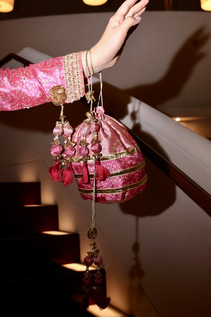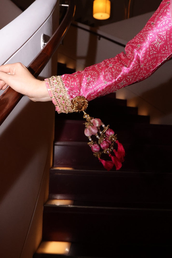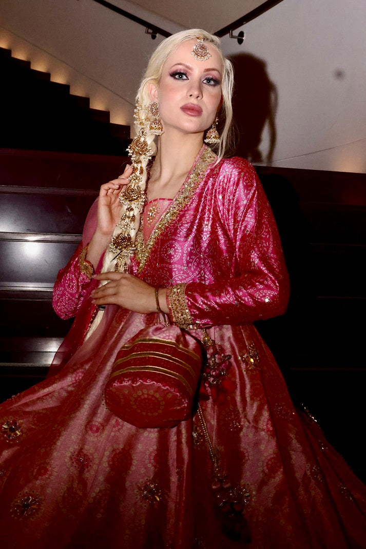 Pink Aura is a stunning kalidaar crafted from luxurious silk bandhani-style fabric featuring subtle, delicate motifs. Designed with an extravagant, full flare, the kalidaar is finished with an opulent gold hem adorned with sequins and 3D gota accents for a radiant festive charm.The bodice showcases intricate mirror work and an elegantly embroidered paan-shaped neckline, further elevated by fine Zardozi detailing. Mirror-adorned sleeves with gota cuffs and handcrafted latkans add a touch of traditional artistry.The ensemble is paired with a soft two-tone pink pure organza dupatta and a matching potli, completing the look with effortless grace. The straight satin silk trouser balances the outfit perfectly.Timeless, refined, and gracefully ornate, this ensemble is ideal for festive gatherings and wedding celebrations.