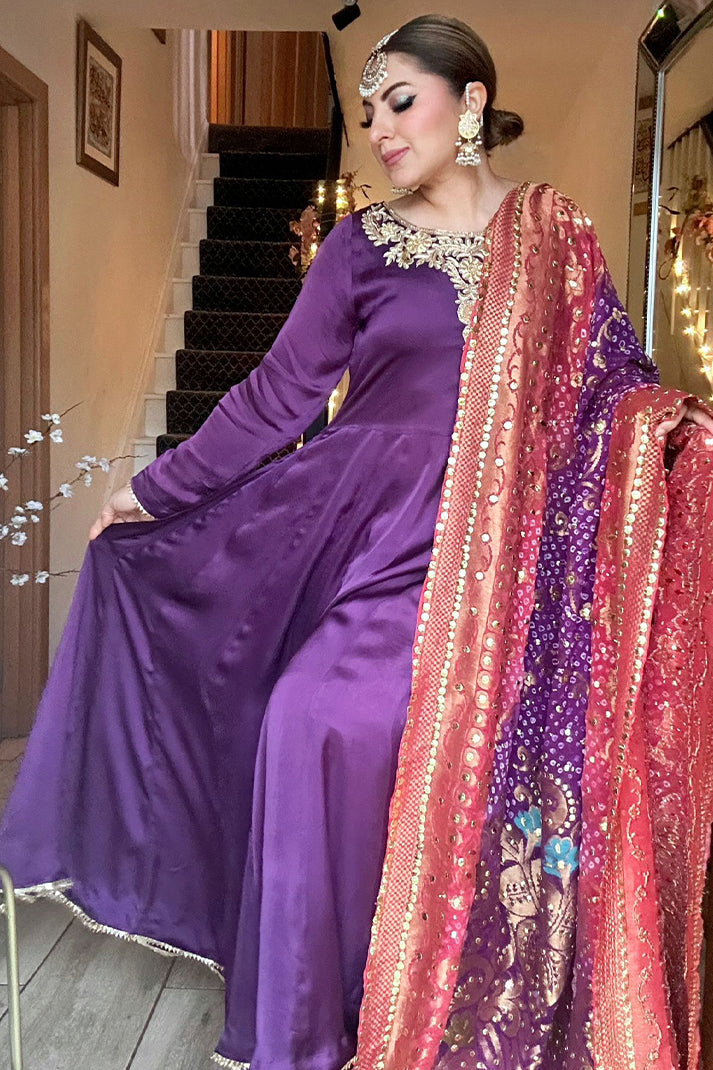 A flowy kalidaar with a wide ghera that take you back in the Mughal fashion which are timeless, we have kept it simple yet classy by giving an intricately hand worked zardozi materials.