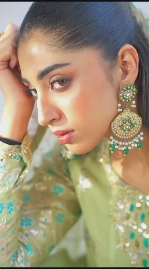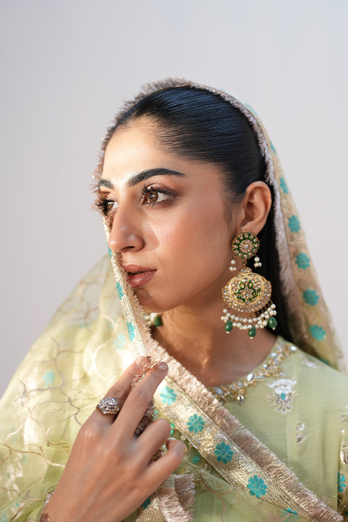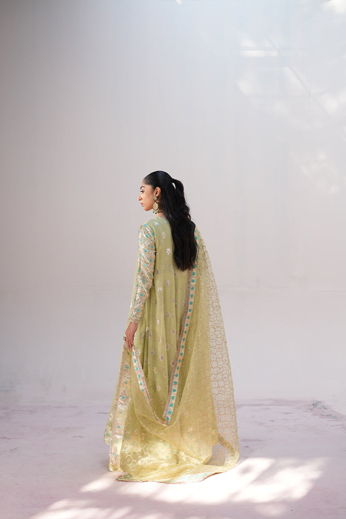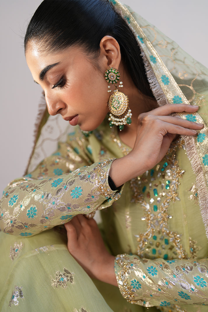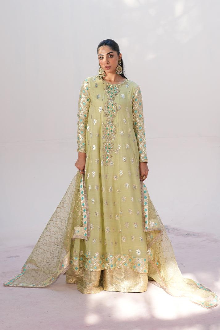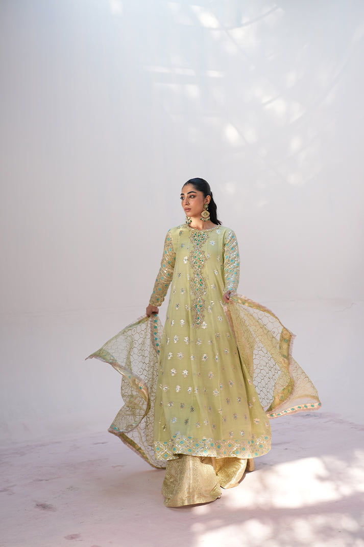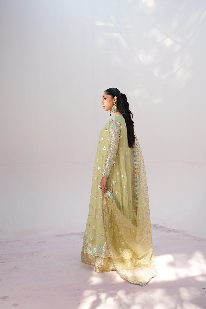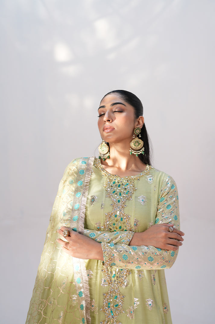 This shimmery outfit with beautiful borders is enhanced with a stunning neckline featuring multiwirk accents. Paired up with a block printed sage green dupatta with borders