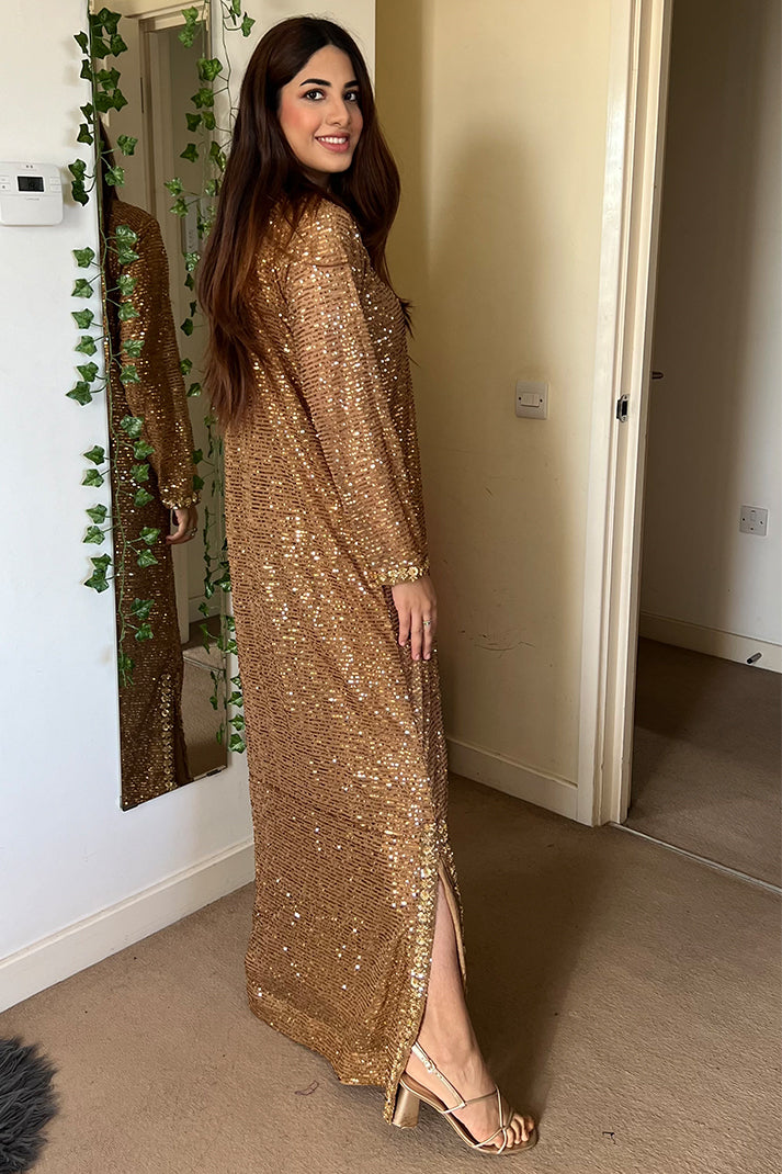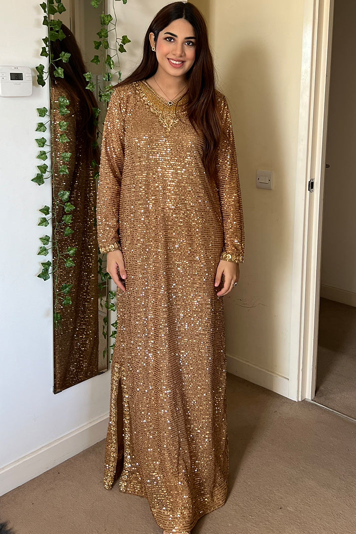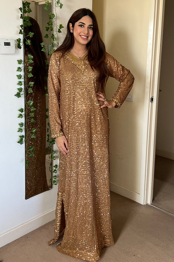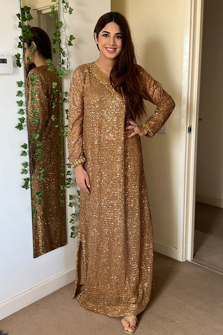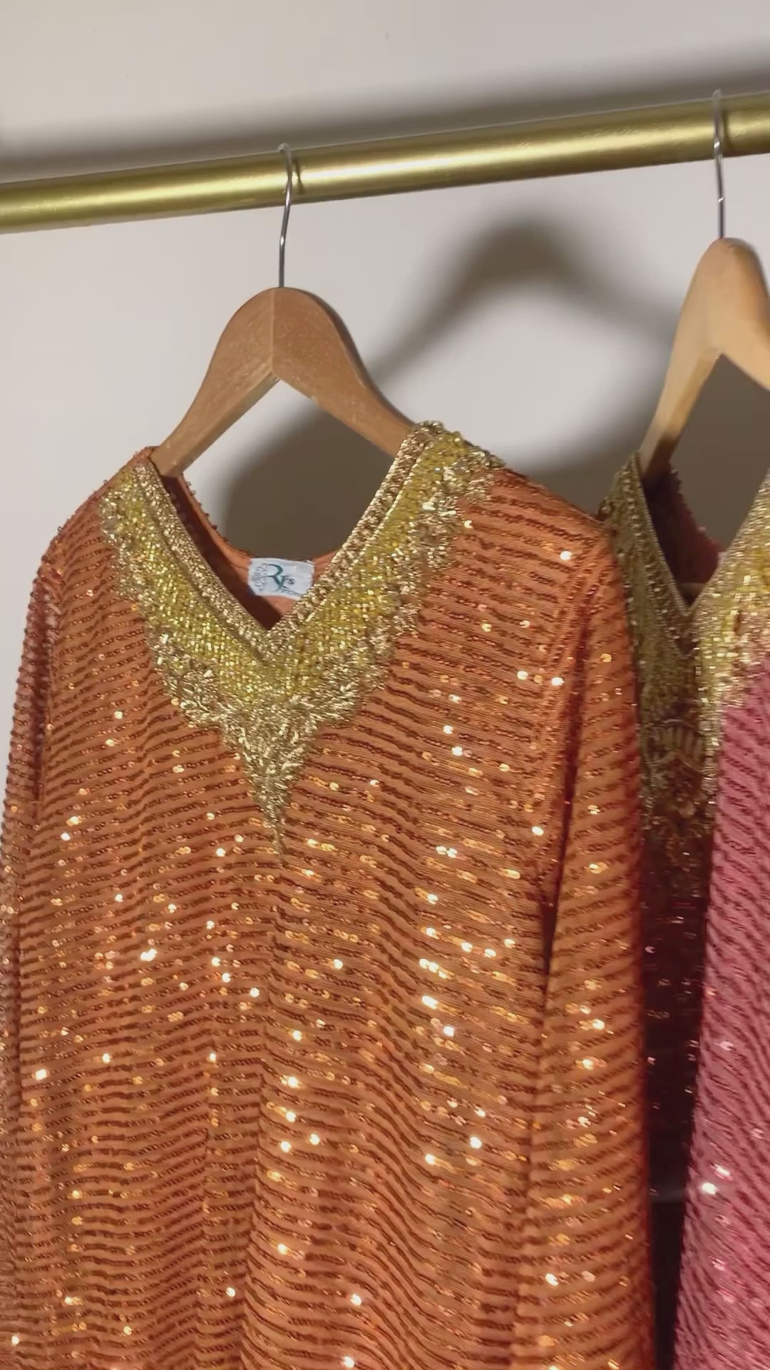 Sparkle - shine wherever you go our super noticeable kaftaan embellished with loads of hand worked using details on the neck line, slits and sleeves which make the sequins base more richer. Available in carrot pink, rusty orange and golden colour.