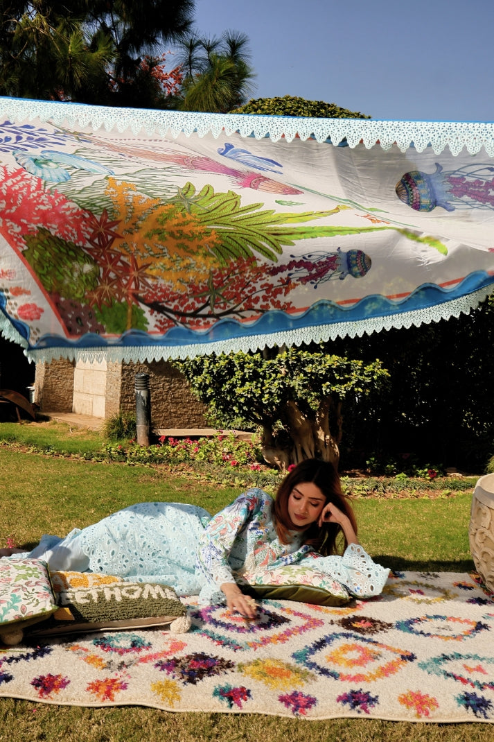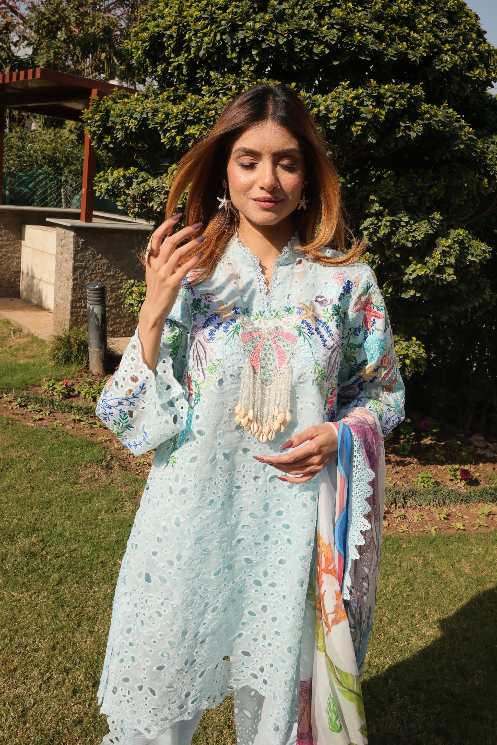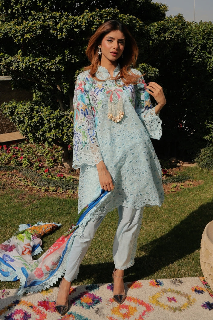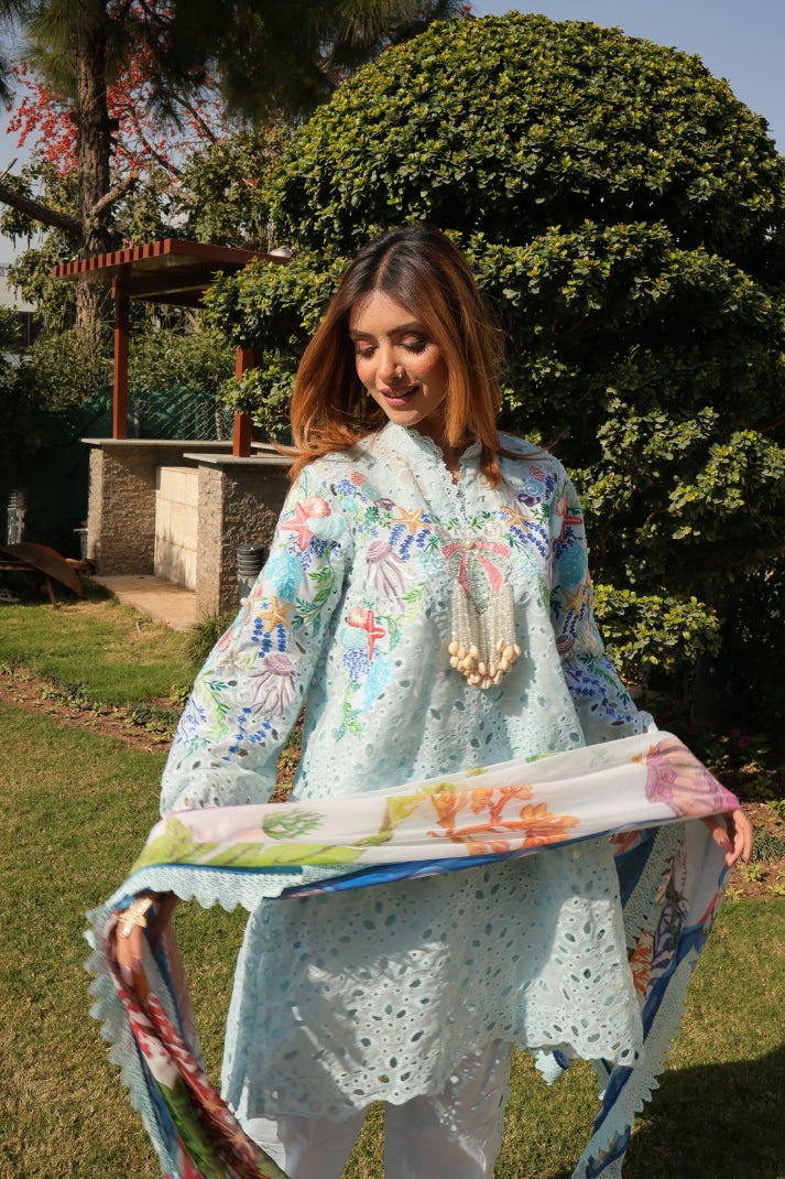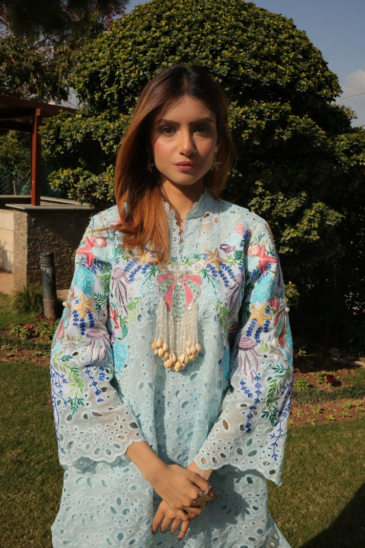 A sold blue chicken kari coord meticulously embroidried by our artisans comprises whimsical elements of the sea life , dazzling embellishments of sea shells, pearls and crystals. You will dive deep into the beautiful coordinated digital silk dupatta portraying the story of sea waves and the mesmerising sea life..