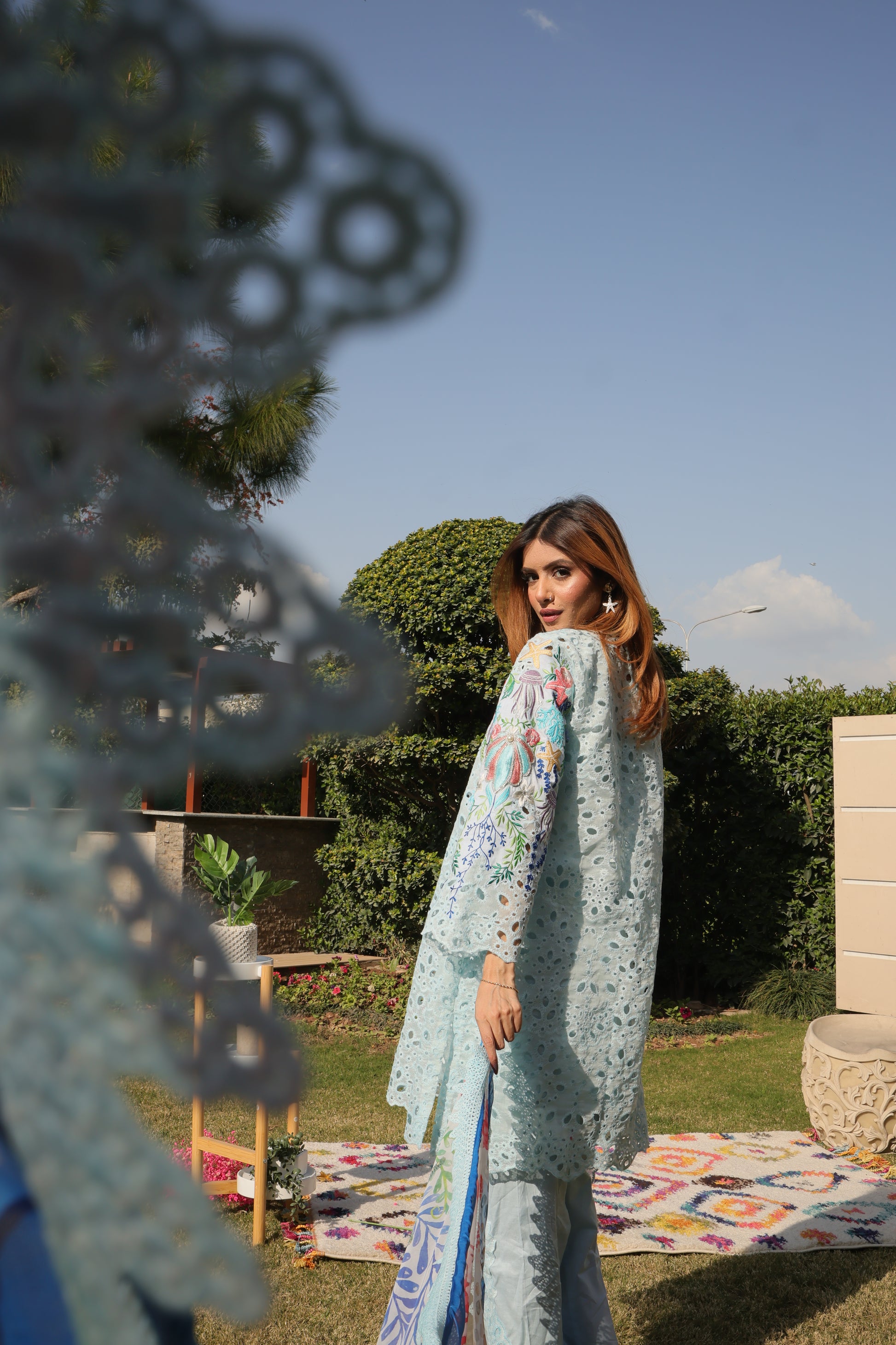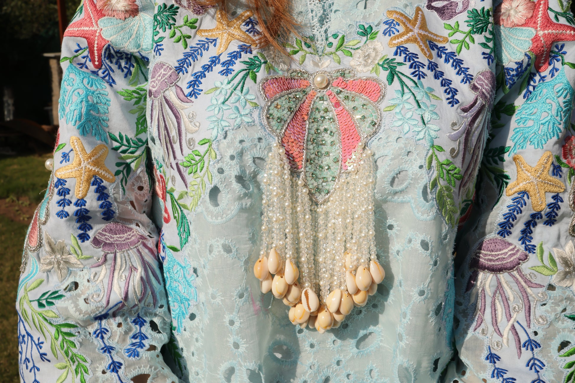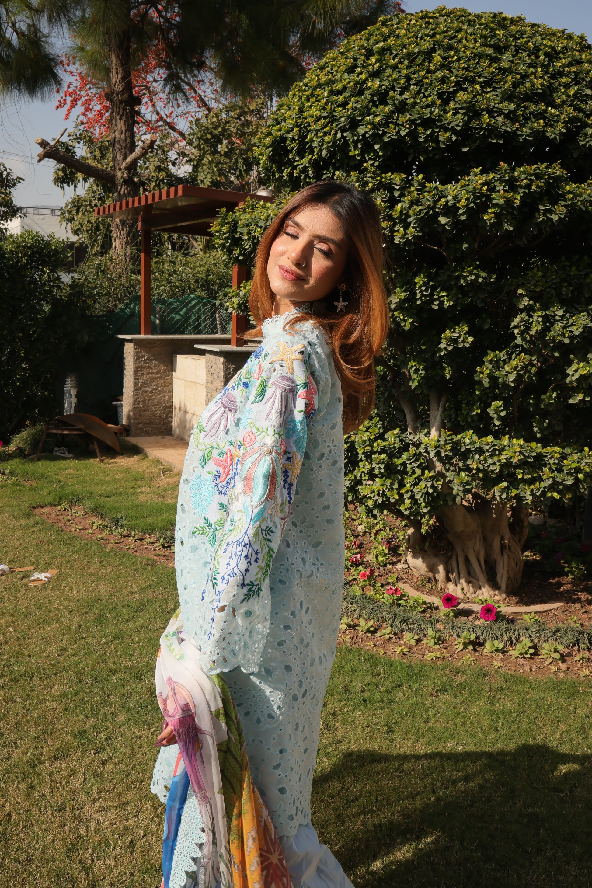 A sold blue chicken kari coord meticulously embroidried by our artisans comprises whimsical elements of the sea life , dazzling embellishments of sea shells, pearls and crystals. You will dive deep into the beautiful coordinated digital silk dupatta portraying the story of sea waves and the mesmerising sea life..